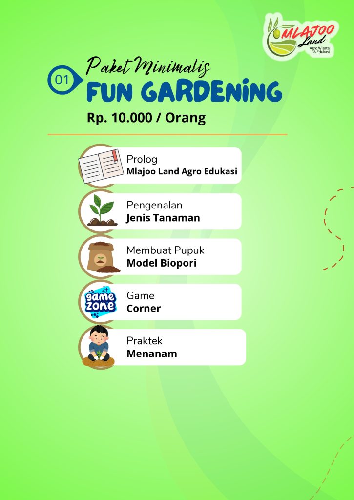 - Fun Gardening Paket Minimalis – Rp10.000/orang (Mengenal tanaman, praktik menanam, pembuatan pupuk biopori, dan permainan edukasi).