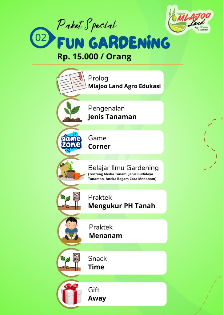 - Fun Gardening Paket Spesial – Rp15.000/orang (Menanam, mengukur pH tanah, belajar berbagai teknik bertani, serta mendapatkan hadiah menarik).