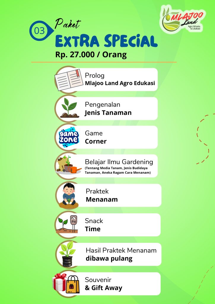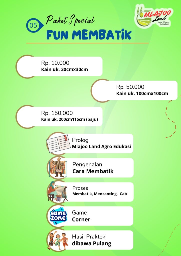 Salah satu keunggulan Mlajoo Land adalah harga paket wisata edukasi yang sangat terjangkau, sehingga bisa diikuti oleh semua kalangan. Berikut adalah daftar paket yang tersedia: