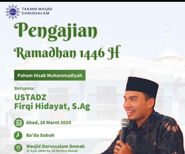 Demak – Takmir Masjid Darussalam Demak yang beralamat di Jalan Kyai Jebat No. 9 menggelar pengajian Ramadhan 1446 H dengan tema Paham Hisab Muhammadiyah. Acara yang diselenggarakan pada Ahad, 16 Maret 2025 ini menghadirkan Ustadz Firqi Hidayat, S.Ag, lulusan PUTM Yogyakarta sekaligus pengajar di Pondok Pesantren Darussalam Demak.