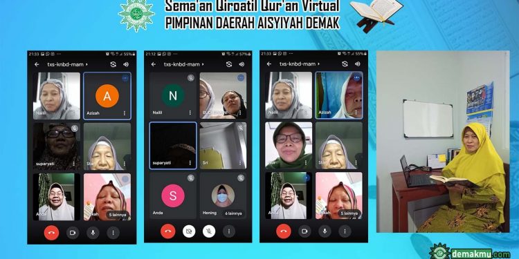 Dalam rangka menjalankan Sunnah Nabi dan dapat meraih keutamaan membaca Alkahfi pada hari Jum at, kegiatan tadarus Al Qur’an tidak dapat dilakukan dengan tatap muka langsung karena pandemi Corona, namun hal ini tidak menyurutkan semangat untuk mencintai Al Qur’an. Beragam cara dilakukan agar Ibu-ibu di Majelis Ta’lim Lansia Qiroatil Qur’an PC Aisyiyah Demak tetap bertadarus Al Qur’an. Dengan semaan Al Qur’an secara virtual setiap malam Jumat mulai pukul 20.00.